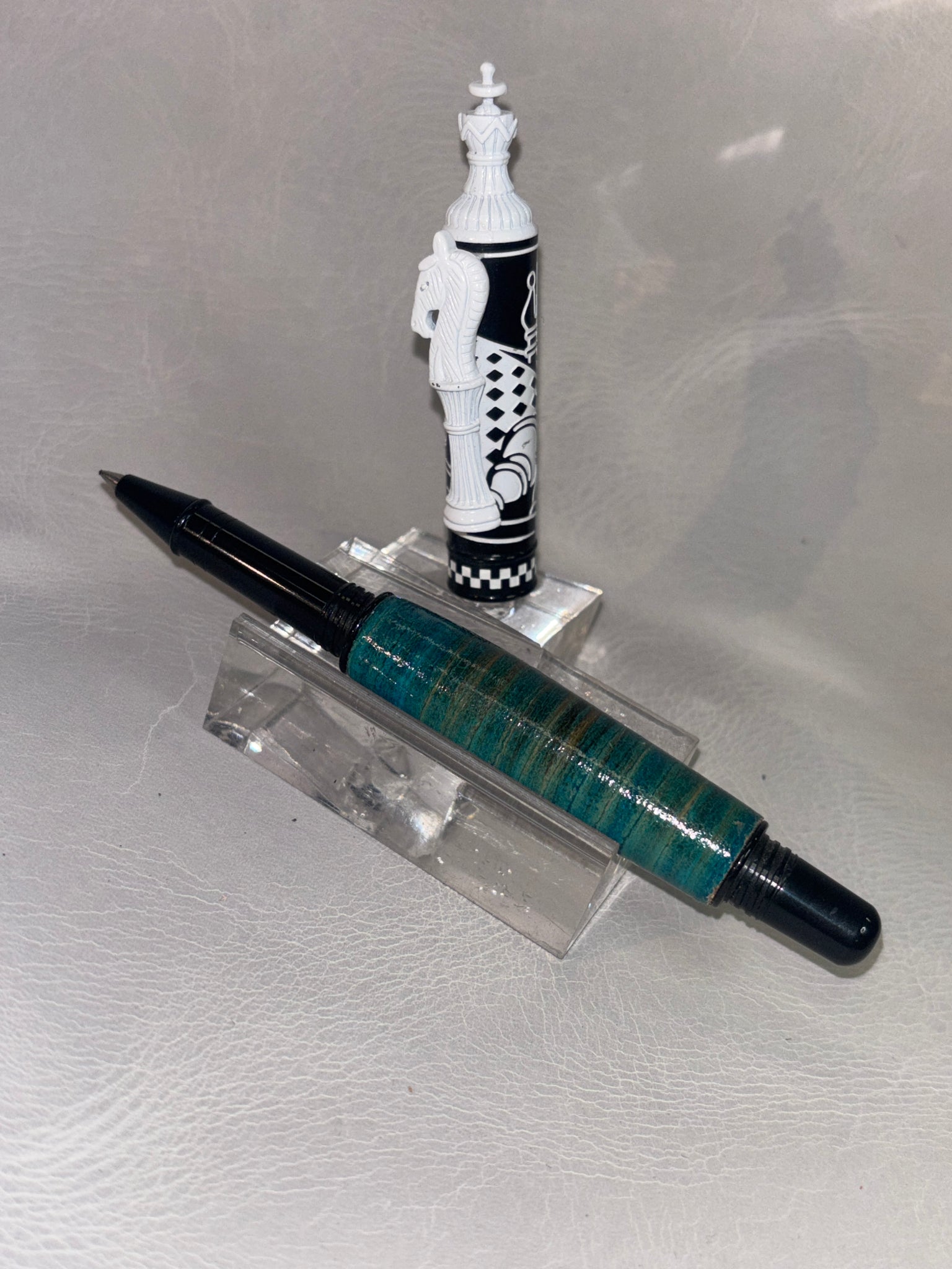 All of our pens are made with stacked leather, turned on a lathe. Each pen is hand-made and one-of-a-kind. If you see a pen you love, don’t let it get away from you, we don’t offer custom pens/offer to try to duplicate a pen we’ve already made. Also, remember to check back from time to time for new styles or different color options for pen styles you've already seen.