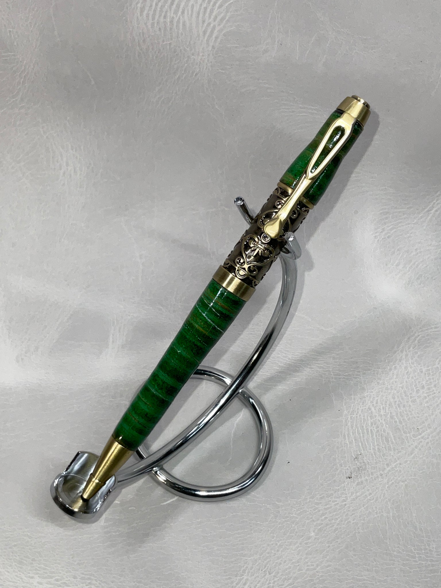 All of our pens are made with stacked leather, turned on a lathe. Each pen is hand-made and one-of-a-kind. If you see a pen you love, don’t let it get away from you, we don’t offer custom pens/offer to try to duplicate a pen we’ve already made. Also, remember to check back from time to time for new styles or different color options for pen styles you've already seen.