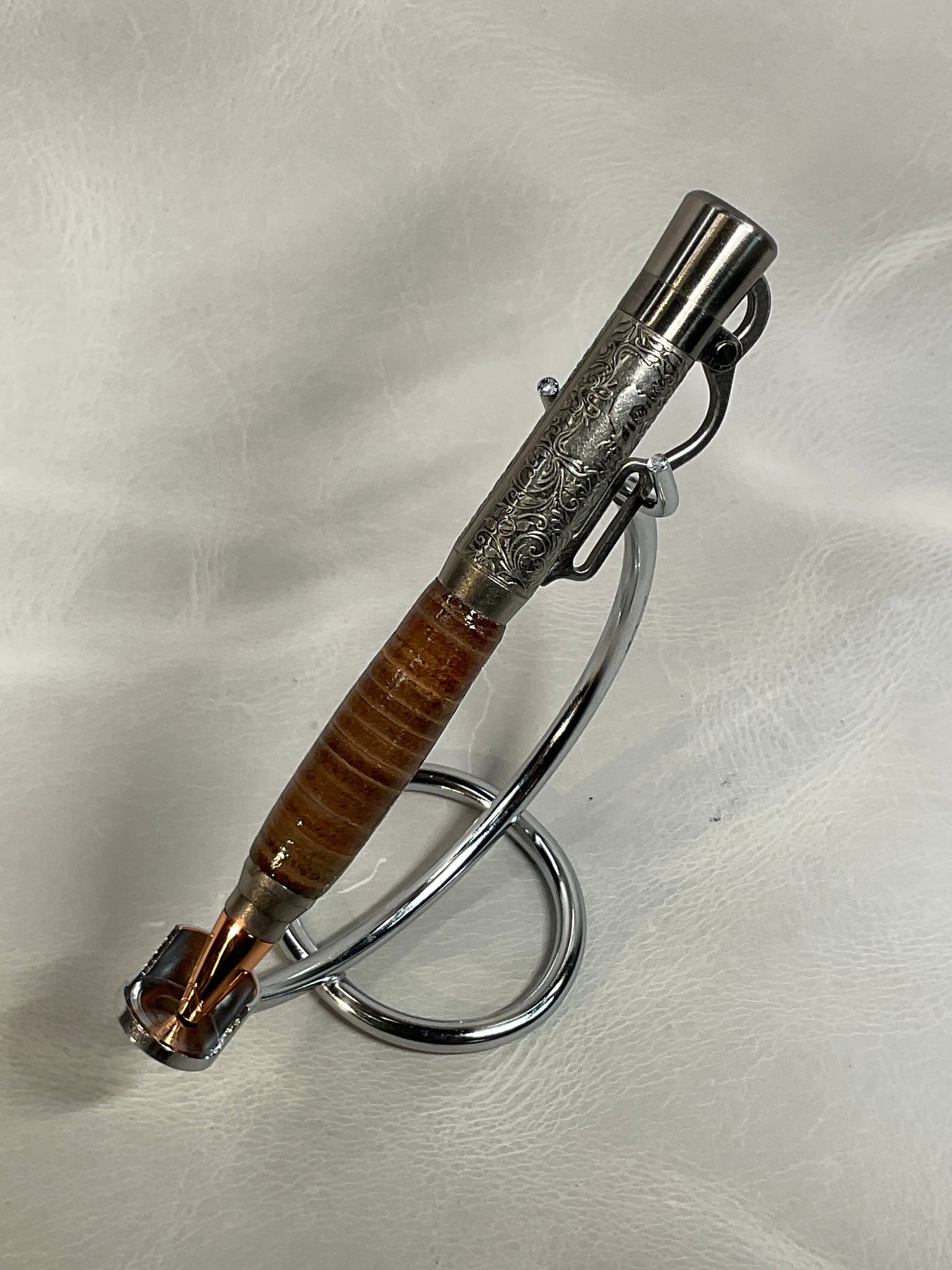 All of our pens are made with stacked leather, turned on a lathe. Each pen is hand-made and one-of-a-kind. If you see a pen you love, don’t let it get away from you, we don’t offer custom pens/offer to try to duplicate a pen we’ve already made. Also, remember to check back from time to time for new styles or different color options for pen styles you've already seen.