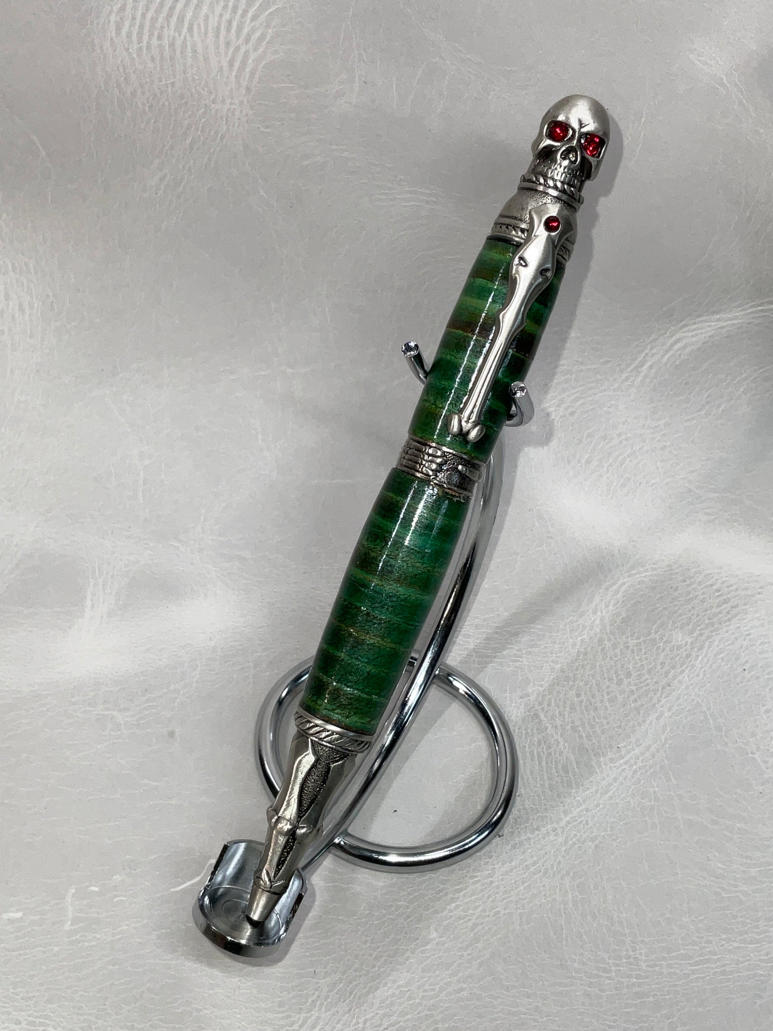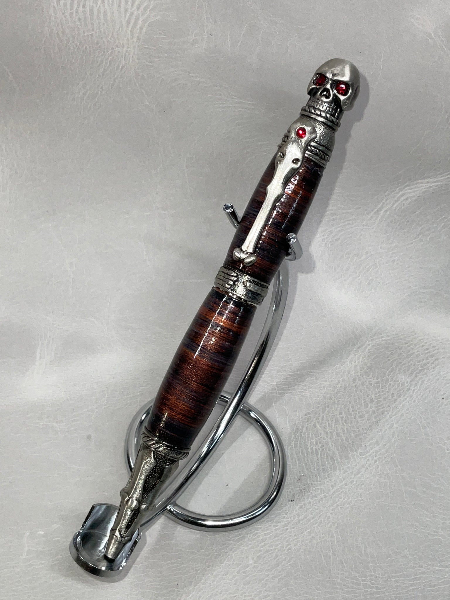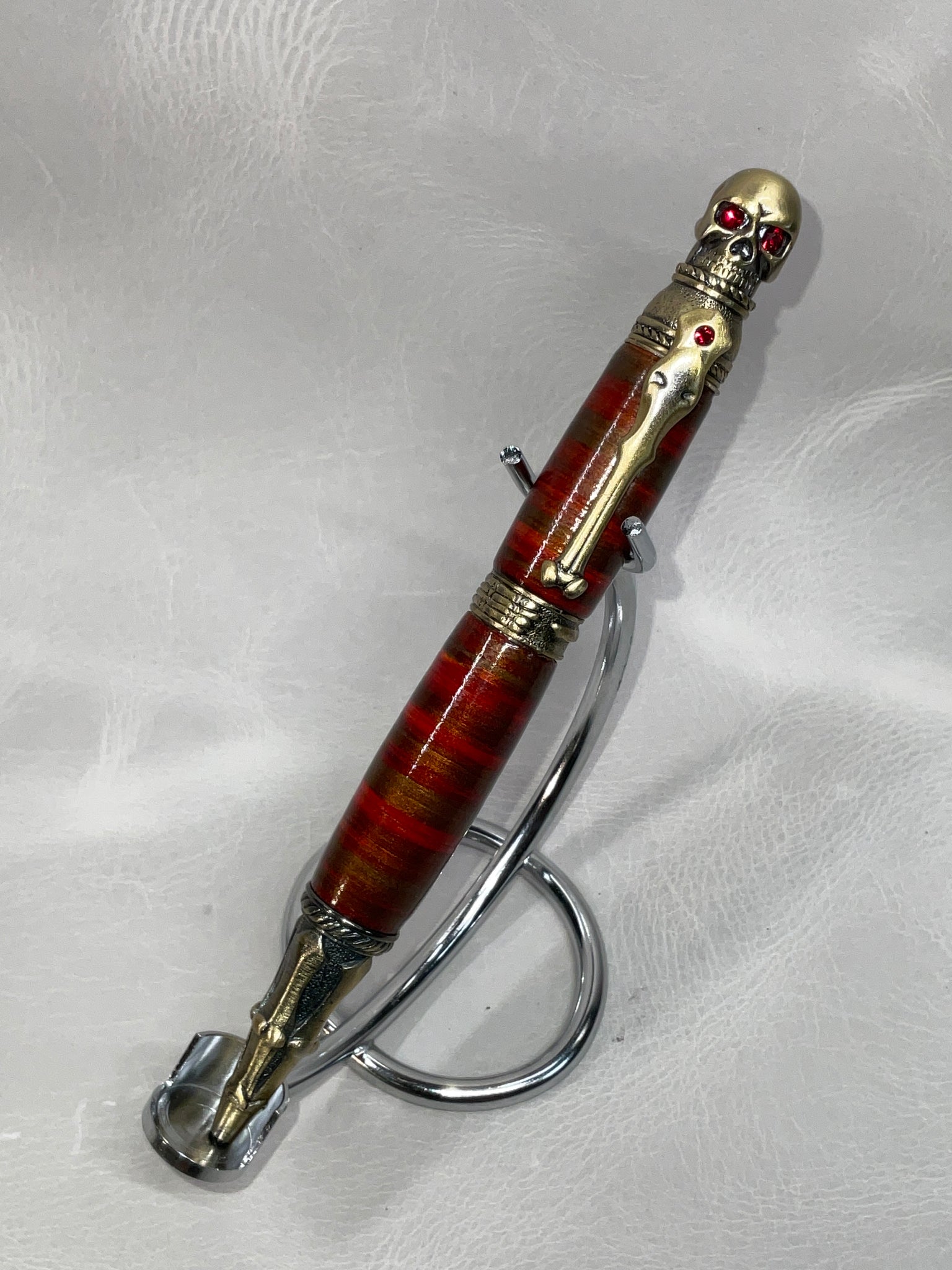 All of our pens are made with stacked leather, turned on a lathe. Each pen is hand-made and one-of-a-kind. If you see a pen you love, don’t let it get away from you, we don’t offer custom pens/offer to try to duplicate a pen we’ve already made. Also, remember to check back from time to time for new styles or different color options for pen styles you've already seen.