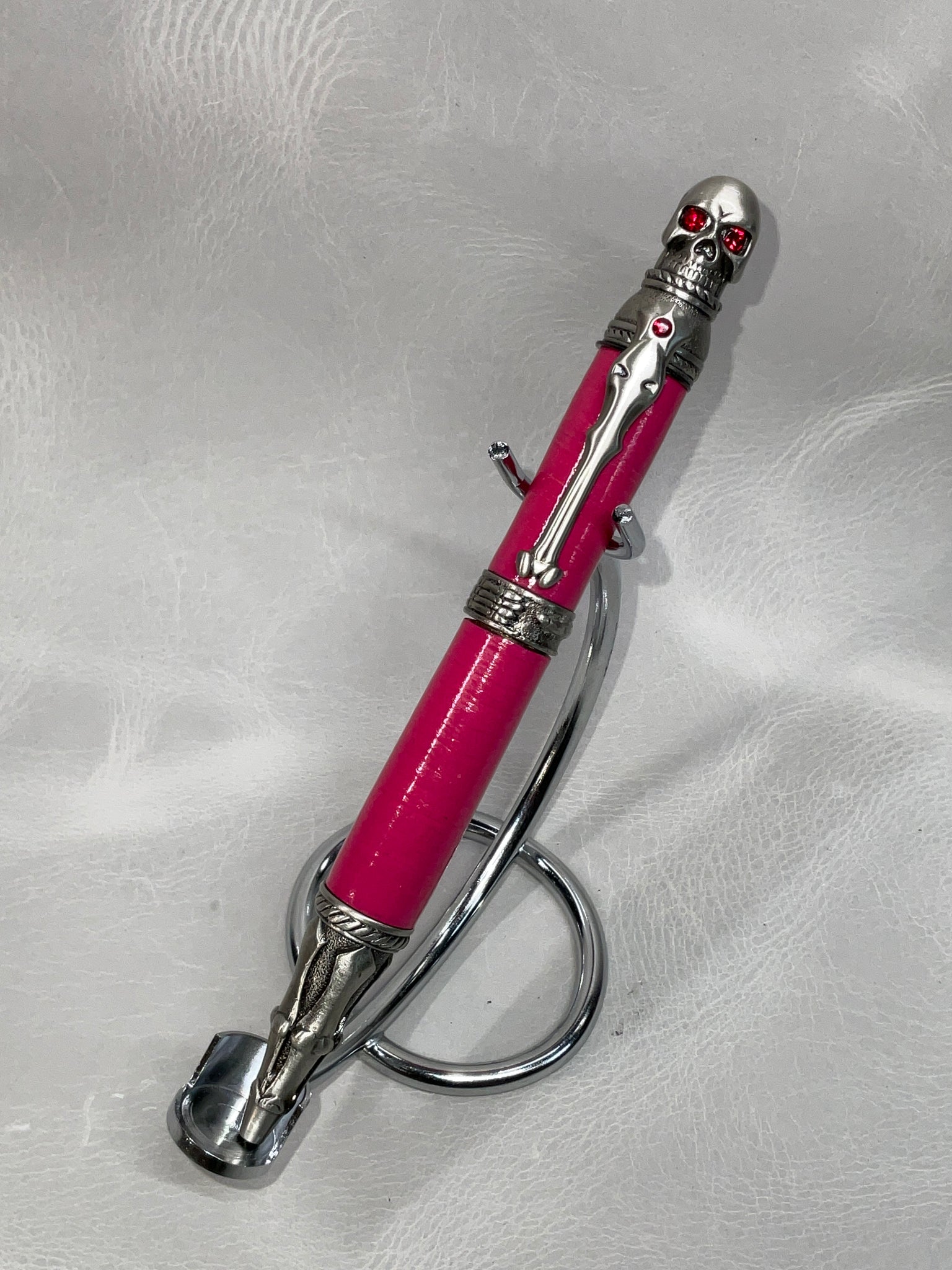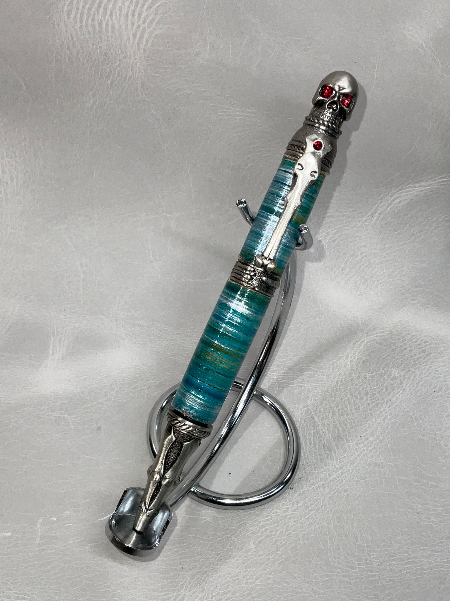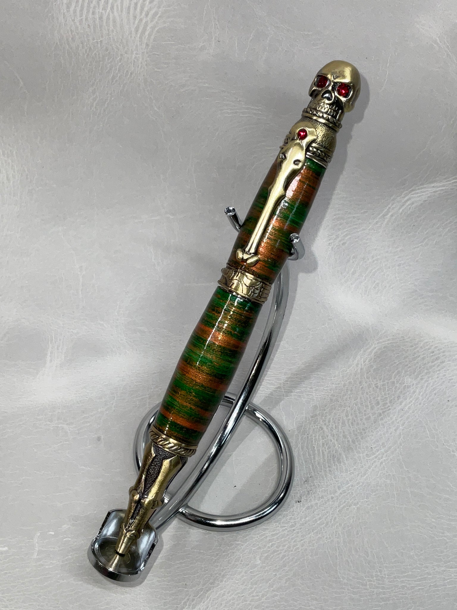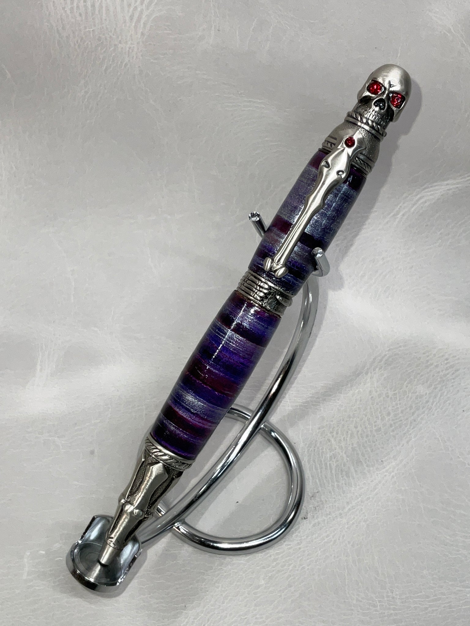 All of our pens are made with stacked leather, turned on a lathe. Each pen is hand-made and one-of-a-kind. If you see a pen you love, don’t let it get away from you, we don’t offer custom pens/offer to try to duplicate a pen we’ve already made. Also, remember to check back from time to time for new styles or different color options for pen styles you've already seen.