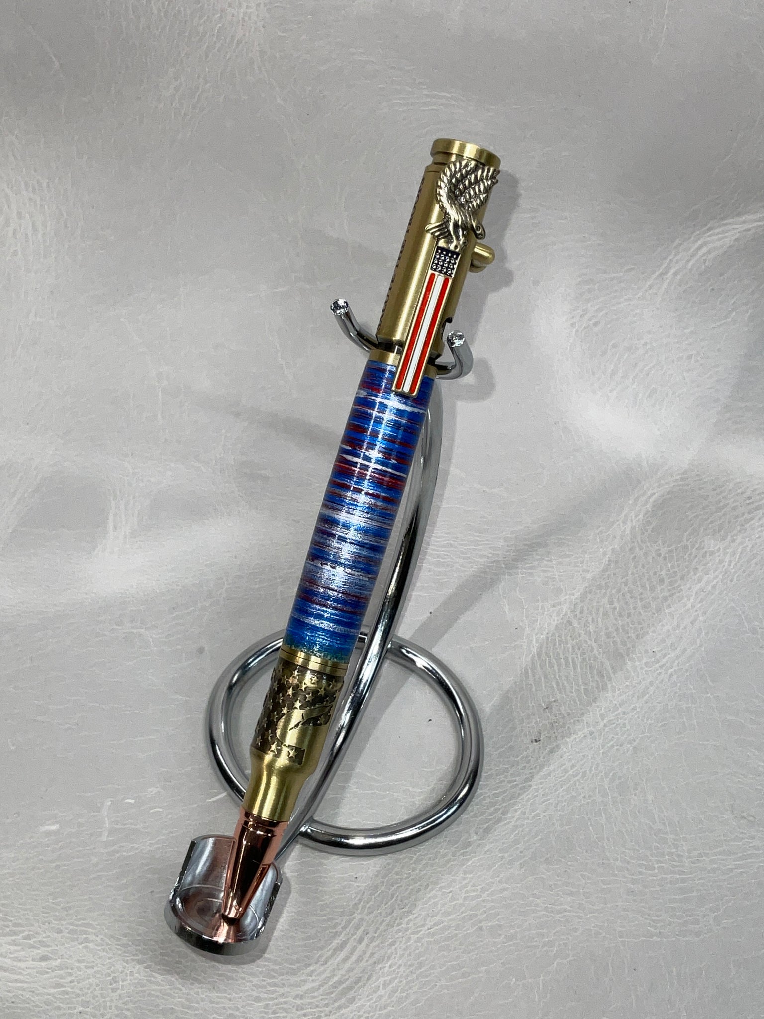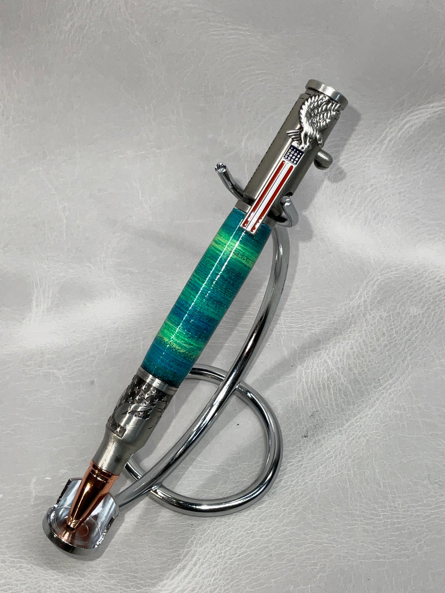 All of our pens are made with stacked leather, turned on a lathe. Each pen is hand-made and one-of-a-kind. If you see a pen you love, don’t let it get away from you, we don’t offer custom pens/offer to try to duplicate a pen we’ve already made. Also, remember to check back from time to time for new styles or different color options for pen styles you've already seen.