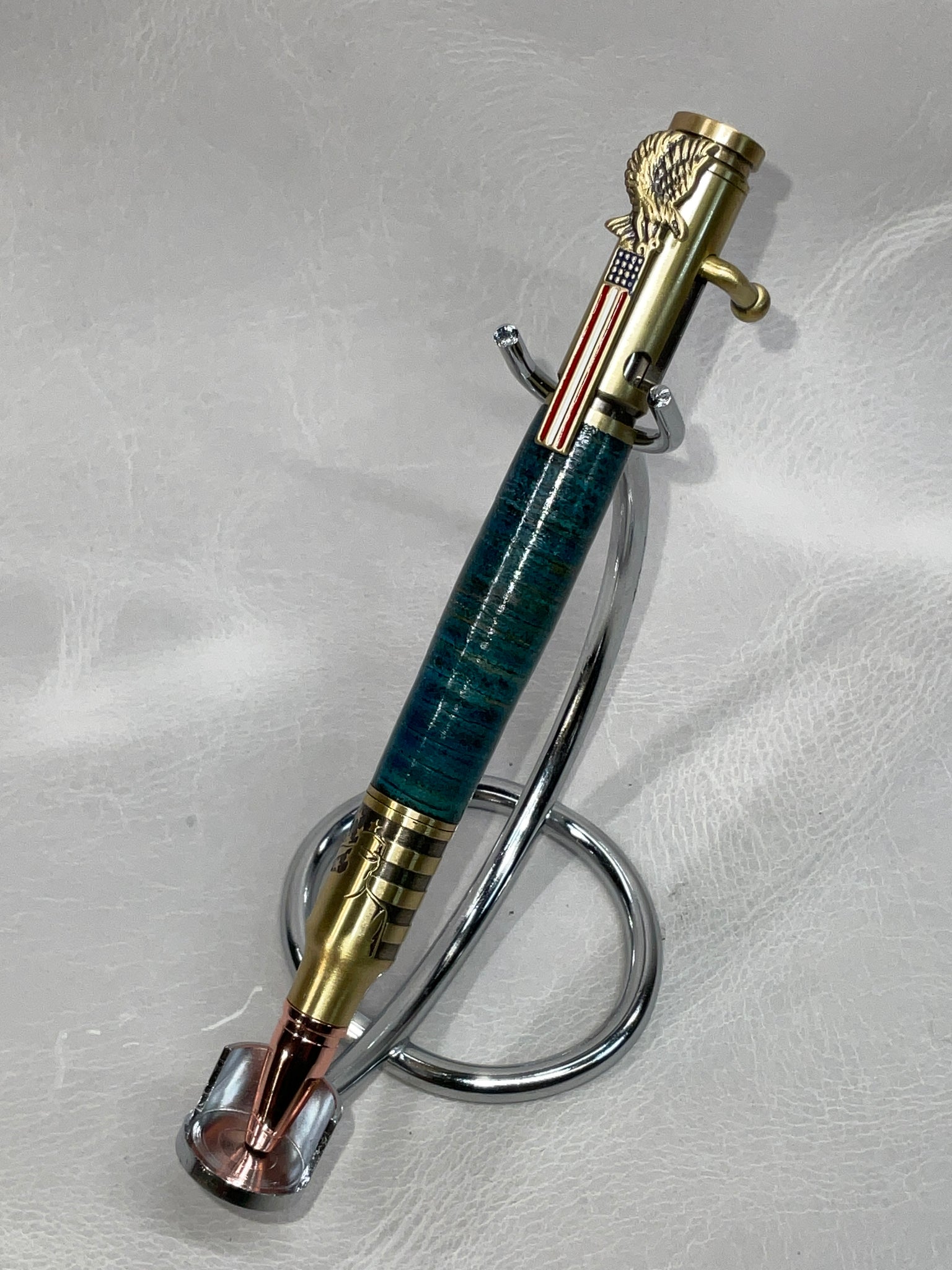 This pen looks like a bullet, has a Eagle and Flag on the clip and A saluting soldier on the tip- but that's not the best part- the ink deployment mechanism is a bolt-action click mechanism.