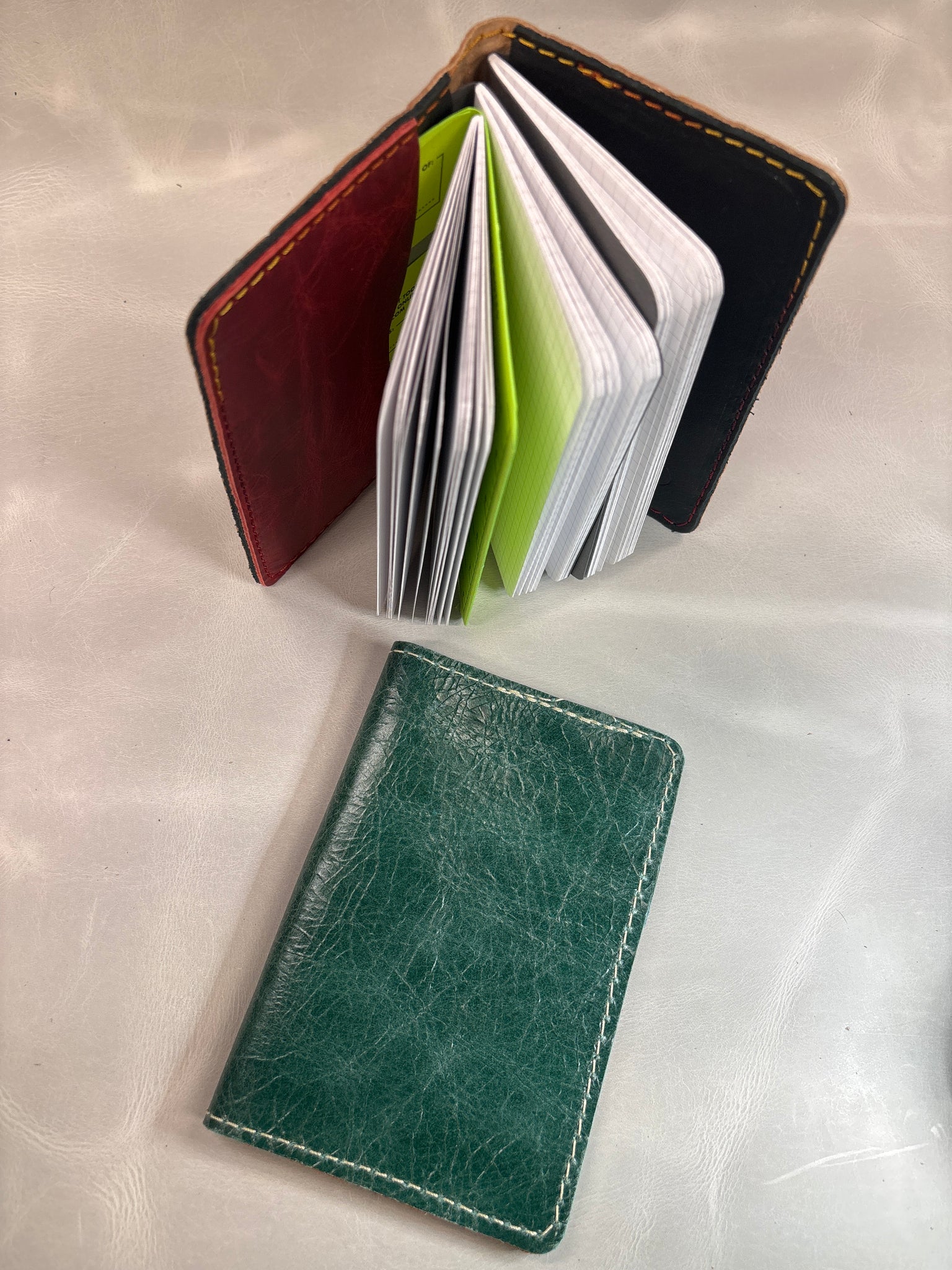 This notebook cover is designed for the 3.5x5.5 Feild Notes book. I can fit up to 3 Books, or less with extra pockets for addition storage of small papers. It will also fit a Passport with a little bit of wiggle room.