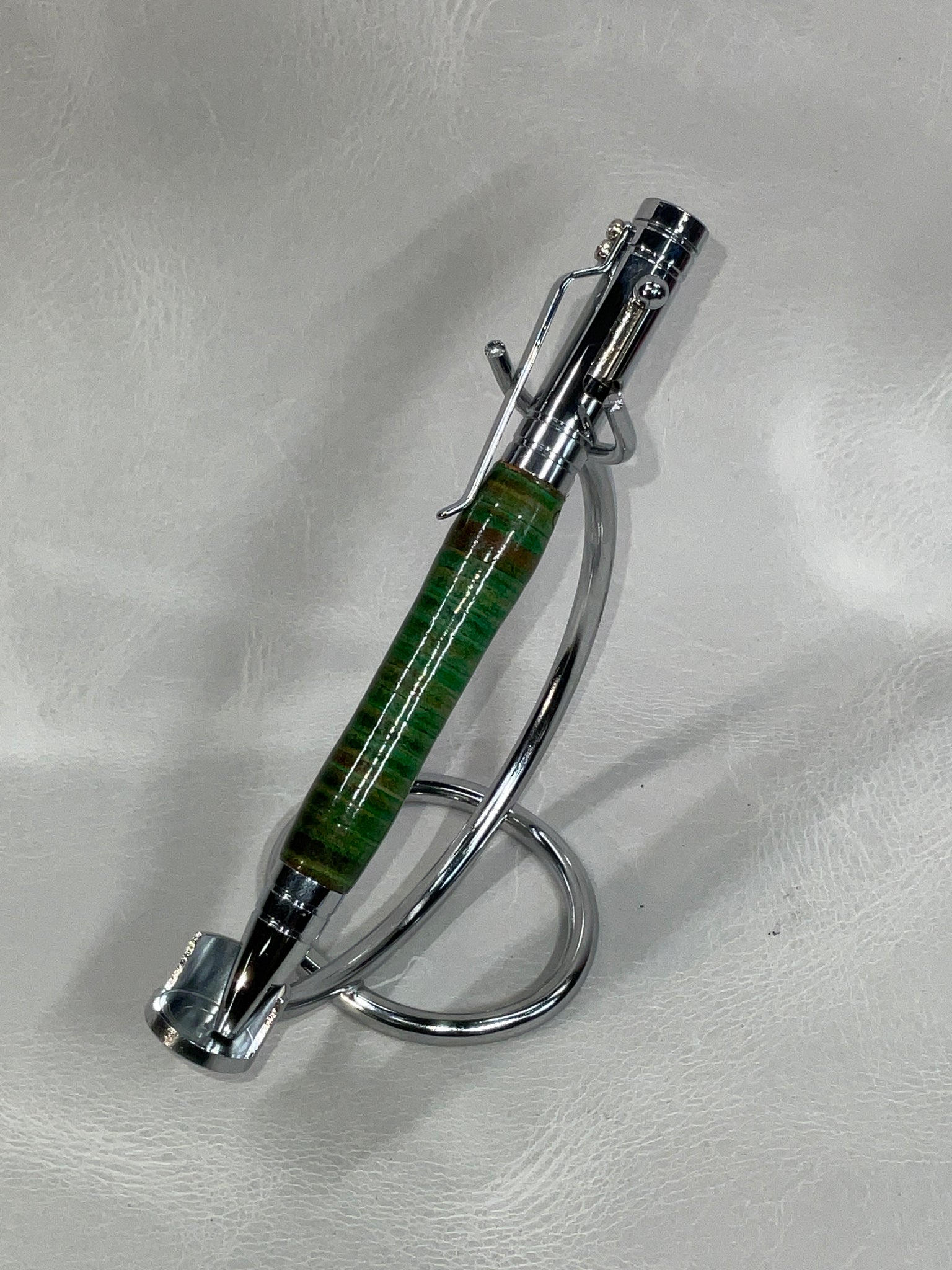 All of our pens are made with stacked leather, turned on a lathe. Each pen is hand-made and one-of-a-kind. If you see a pen you love, don’t let it get away from you, we don’t offer custom pens/offer to try to duplicate a pen we’ve already made. Also, remember to check back from time to time for new styles or different color options for pen styles you've already seen.